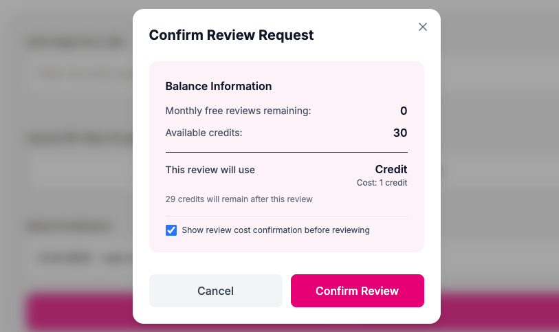 You will be prompted to confirm the consumption of your credit or free review quota. By default, monthly free review quota will be used first before consuming any of your credits.