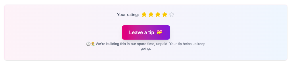 Review credits are now available at very affordable rates (we donโt make a profit from them). To give you another way to support us, weโve added a โLeave a tipโ button that appears when you leave a rating of 4 or 5. You can choose how many credits to tip โ think of it as buying our developers a coffee.