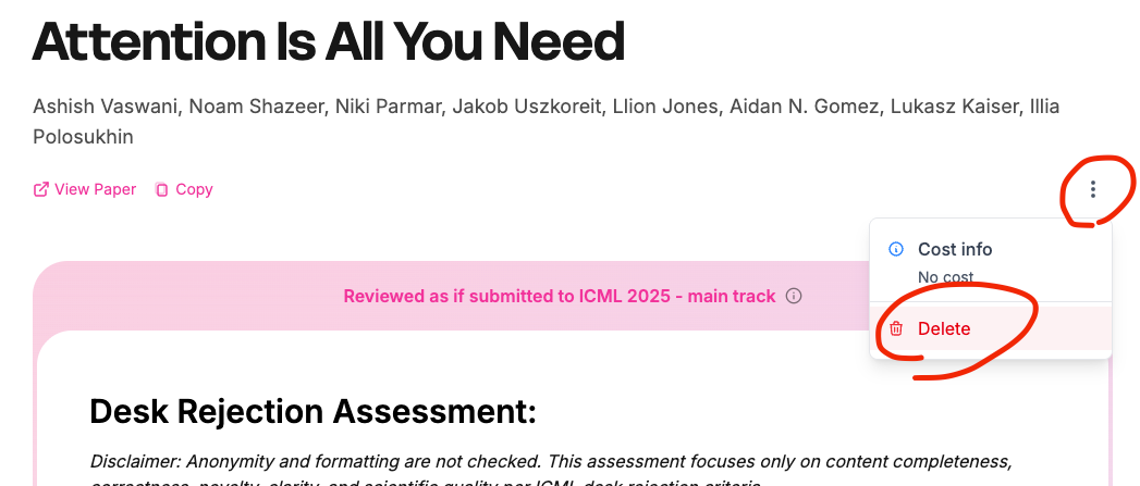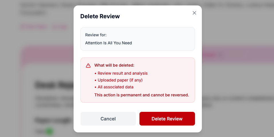 You now have full control over your review data. From the review results page of any paper, click the โ...โ (three-dot) menu and select Delete to remove the data associated with that review.
