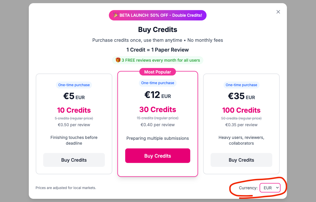 If youโd like more reviews, you can purchase credits. 1 credit = 1 full review. Currently, we offer three packages (see below). You can choose your preferred currency (USD, EUR or CNY) in the menu highlighted by red circle below. The receipt/invoice will be emailed to you right after your purchase.