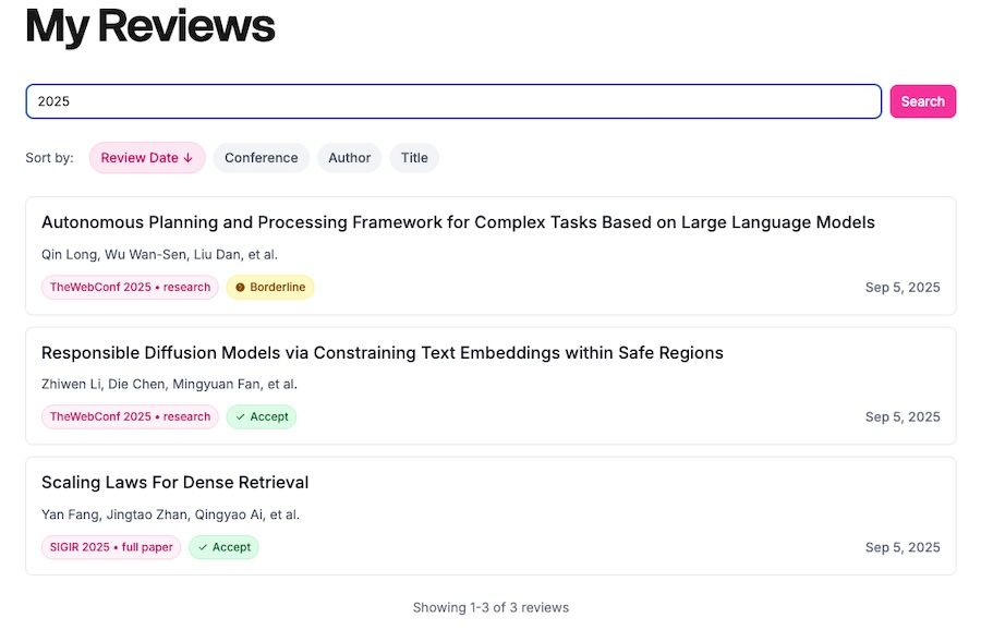 • Sorting Options: Sort reviews by date, conference, author, or title.