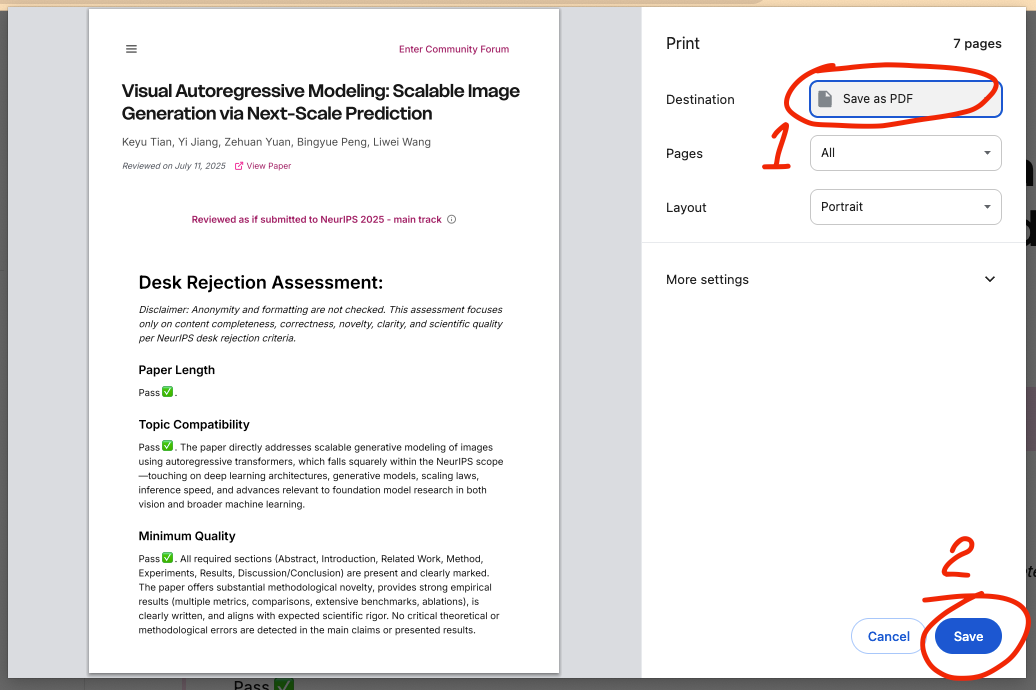 - On the popped-up Print dialog UI, choose "Save as PDF" (1) and hit save (2) to choose a place you want to export it to. Then you have a PDF exported containing all review and paper informations and clickable hyperlinks.